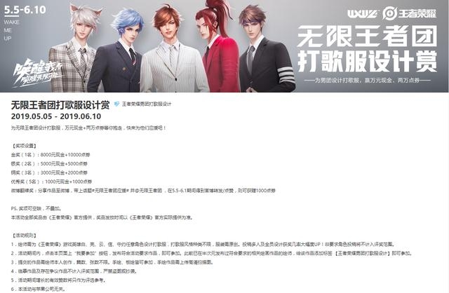 有了单曲之后,怎么能不打歌呢,但是问题来了,无限王者团既然要打歌,怎么能没有打歌服呢?所以官方也开始了打歌服的有奖征集活动,擅长设计的朋友可以踊跃投稿,风格和种类都不限,可以投稿单人,也可团队设计五人的,但是有要求,只能设计守约。诸葛、韩信、李白、赵云这五位英雄的,大家赶紧去开动脑筋啊~