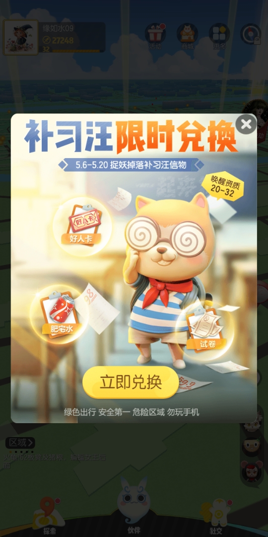 活动介绍:御灵师们在进行捉妖后会获得来自补习汪的不同信物,收集指定数量的【肥宅快乐水】、【好人卡】及【试卷】即可兑换汪宝符印,从而唤醒或升级补习汪!