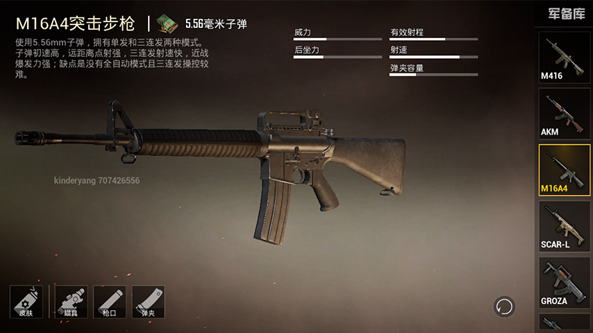 从配件上来看,M16A4无法装备握把,虽然握把对步枪的提升非常的大,但是这也让M16A4对配件的需求非常低。不过由于缺少全自动开火模式也意味着如果没有非常强大的控枪技术与手速,在近距离遭遇战时将会吃不少亏。