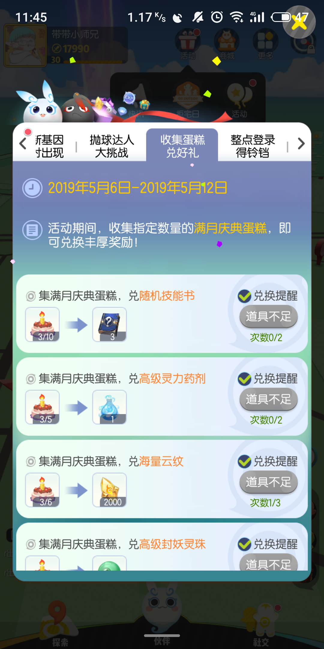 集6个满月庆典蛋糕,兑海量云纹。集5个满月庆典蛋糕,兑高级封妖灵珠。