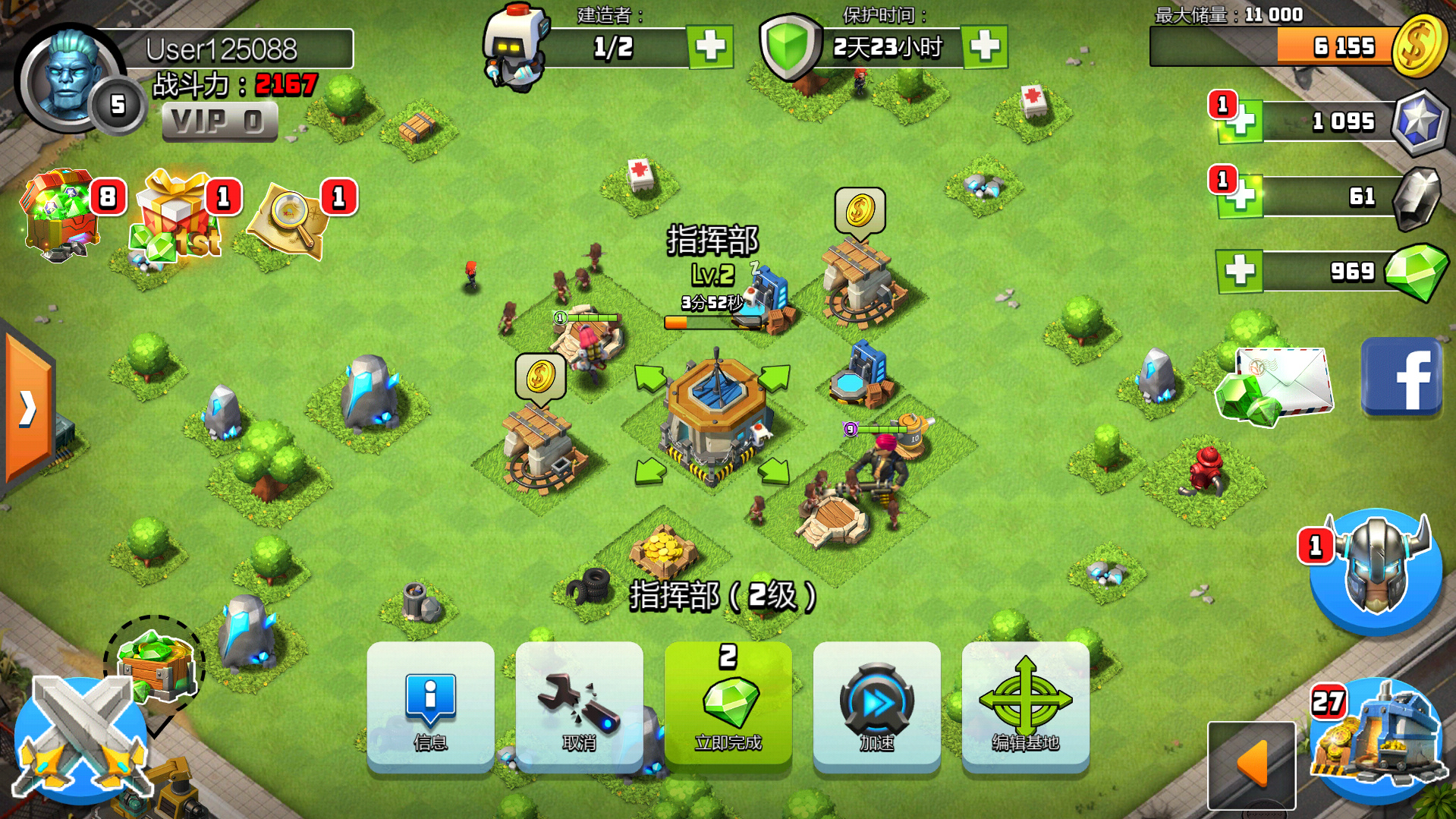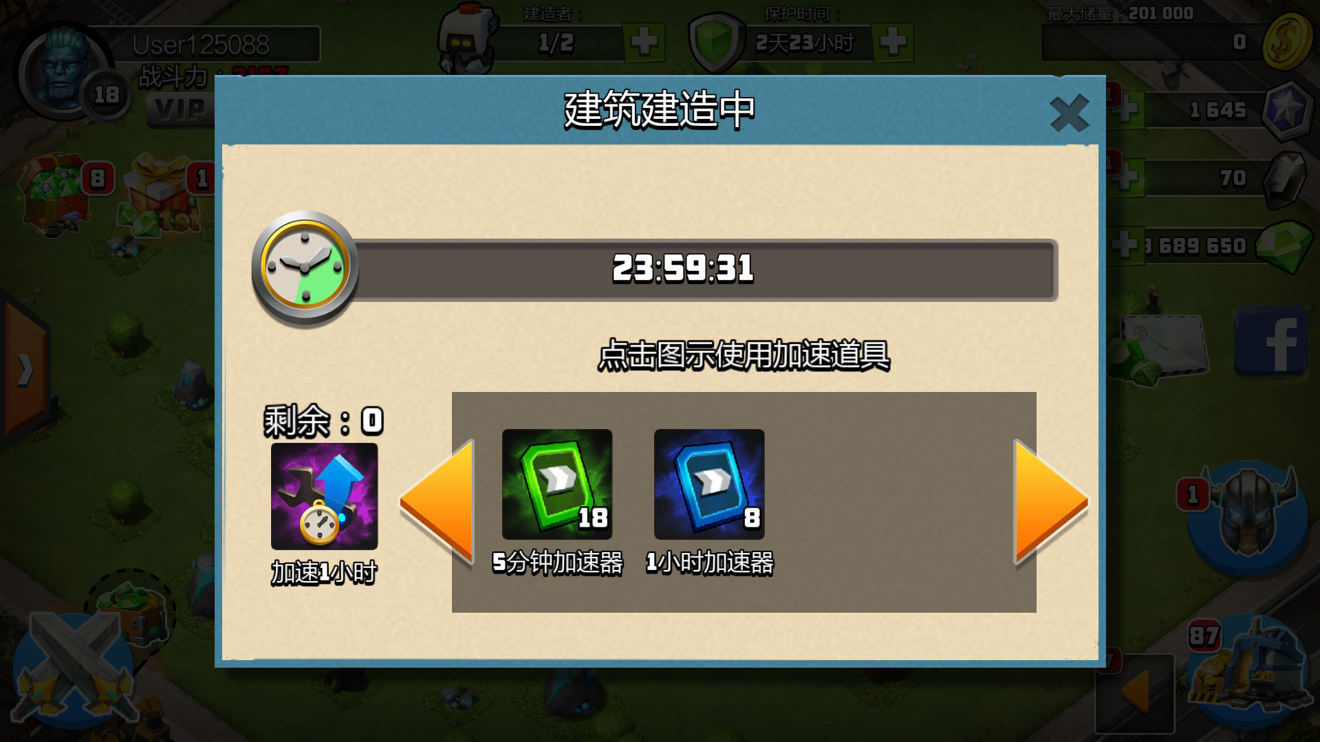 同样,继续进行闯关战和掠夺战,建造建筑,将指挥部升级到5级,其他建筑不升级。5级指挥部需要一天才能升级完成,我们可以使用系统送的加速器来快速完成升级,不要吝啬。