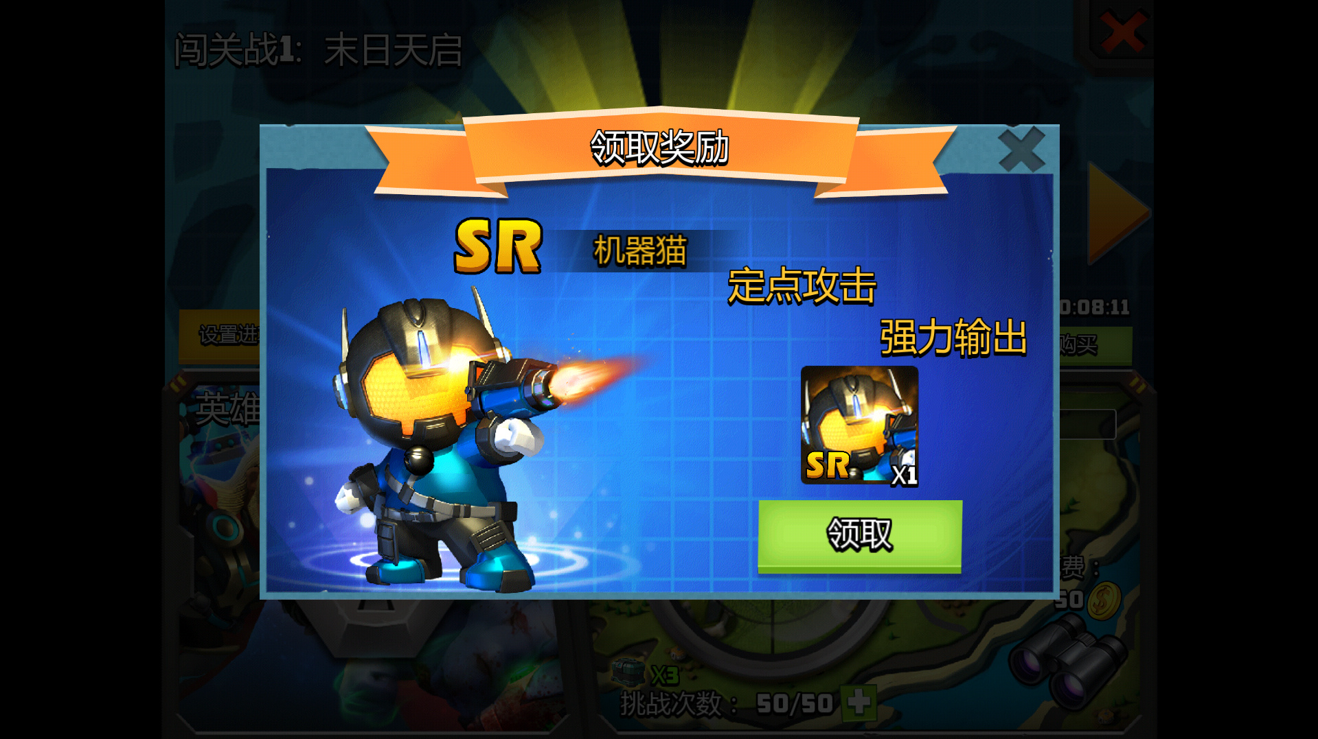 当金币不够的时候去打闯关战和掠夺战,闯关战到第六关的时候会获得一个强力SR级英雄机器猫,得到机器猫后专注培养它就行,系统送的其他英雄都不用培养。