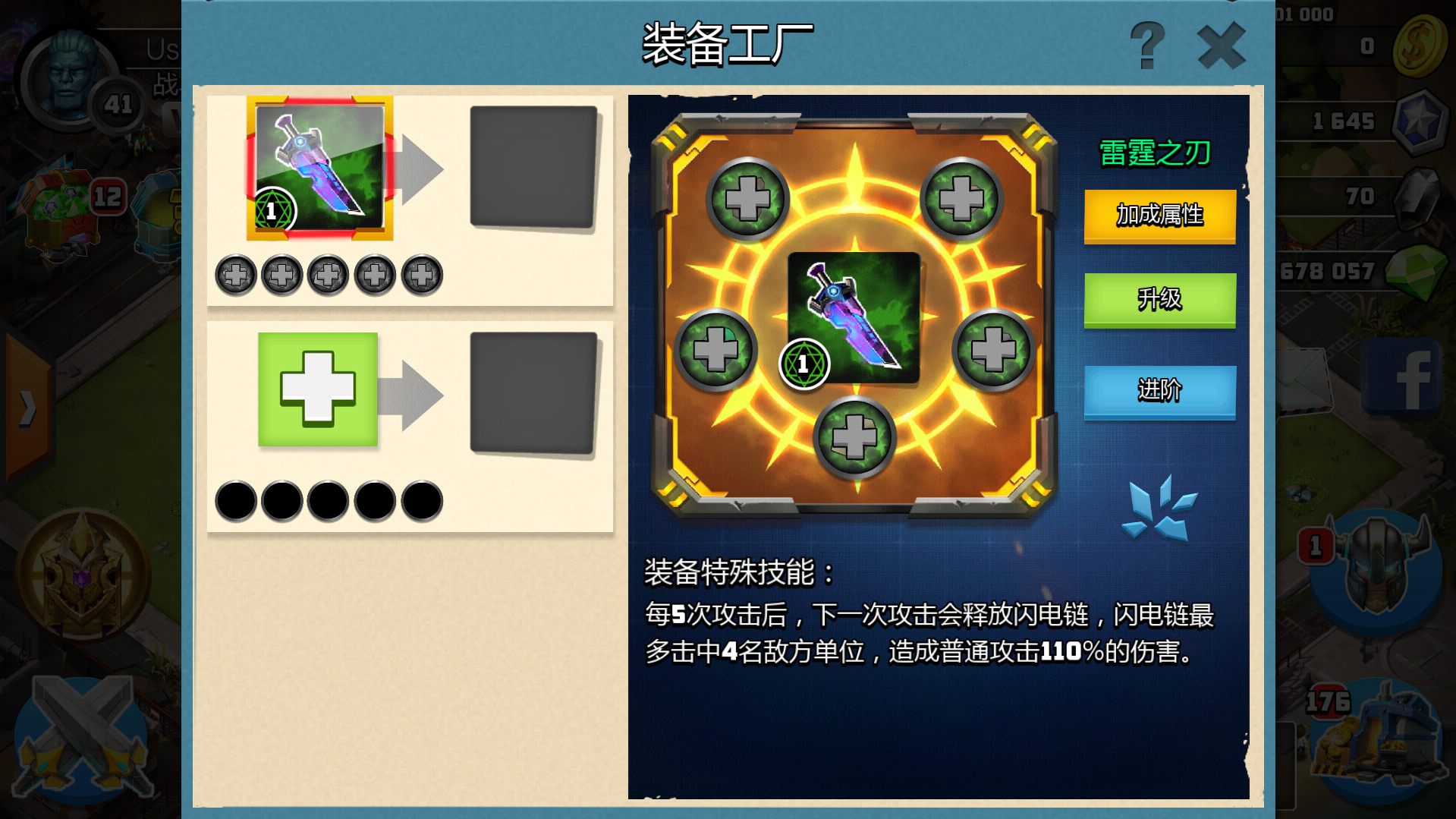 六、7级指挥部: 建造装备工厂,解锁装备锻造和僵尸来袭。装备用系统送的雷霆之刃,僵尸来袭能打得过就打,打不过就放着,等战斗力提升了再考虑挑战。