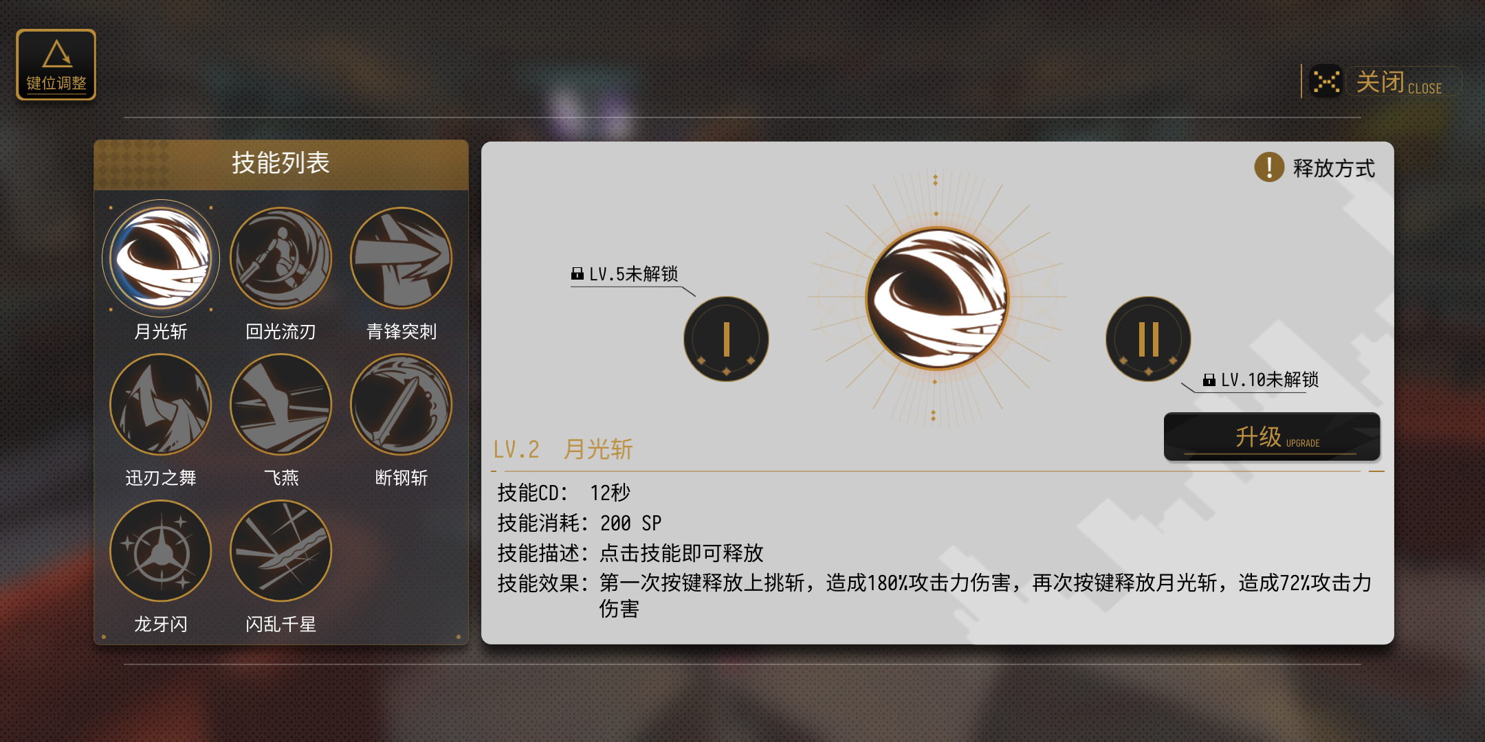 点击主界面右上角,选择角色就能看到技能了,点开后我们可以看到当前角色的所有技能,右上角的键位调整可以让技能位置重新摆放,搭配顺手的连招也是提升伤害的方法哦。技能列表中所有的技能都是可以升级的,右边的释放方式也会清楚的告诉你这个技能的使用方法,有的技能包含多段攻击,也就是不止能按一次,大家一定要记住。