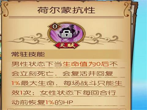 荷尔蒙抗性:男性状态下当生命值为0后不会立刻死亡,会复活并恢复1%最大生命,每场战斗只能生效1次;女性状态下每回合行动前恢复1%的HP。