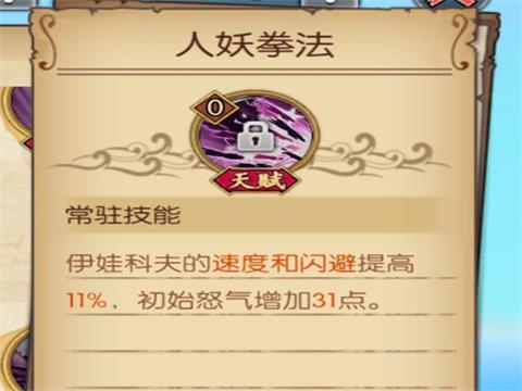 人妖拳法:伊万科夫的速度和闪避提高11%(初始),初始怒气增加31点。