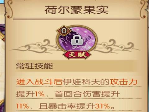 荷尔蒙果实:进入战斗后伊万科夫的攻击力提升1%,首回合伤害提升11%,且暴击提升31%