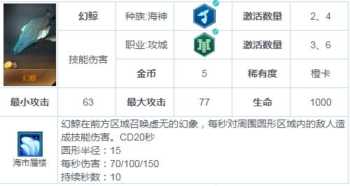 由于目前游戏中仅有4张橙卡,所以该拿还是要拿的。只不过这张幻鲸可能因为buff优异的配置而导致实战效果在4张橙里排名倒数,技能发动很缓慢,一个范围持续aoe。这张卡的优势在于对于敌方的铁桶阵或者肉盾旗子或者闪避高的棋子多时能打出巨量aoe,缺点是怕分散站位,怕控制以及削蓝的套路。总之这是一张绝对不能称之为弱的棋子,和端游的迷团一样它是一张在特定场合发生巨大作用的key牌。当然大多时候都需要它的原因是凑buff。