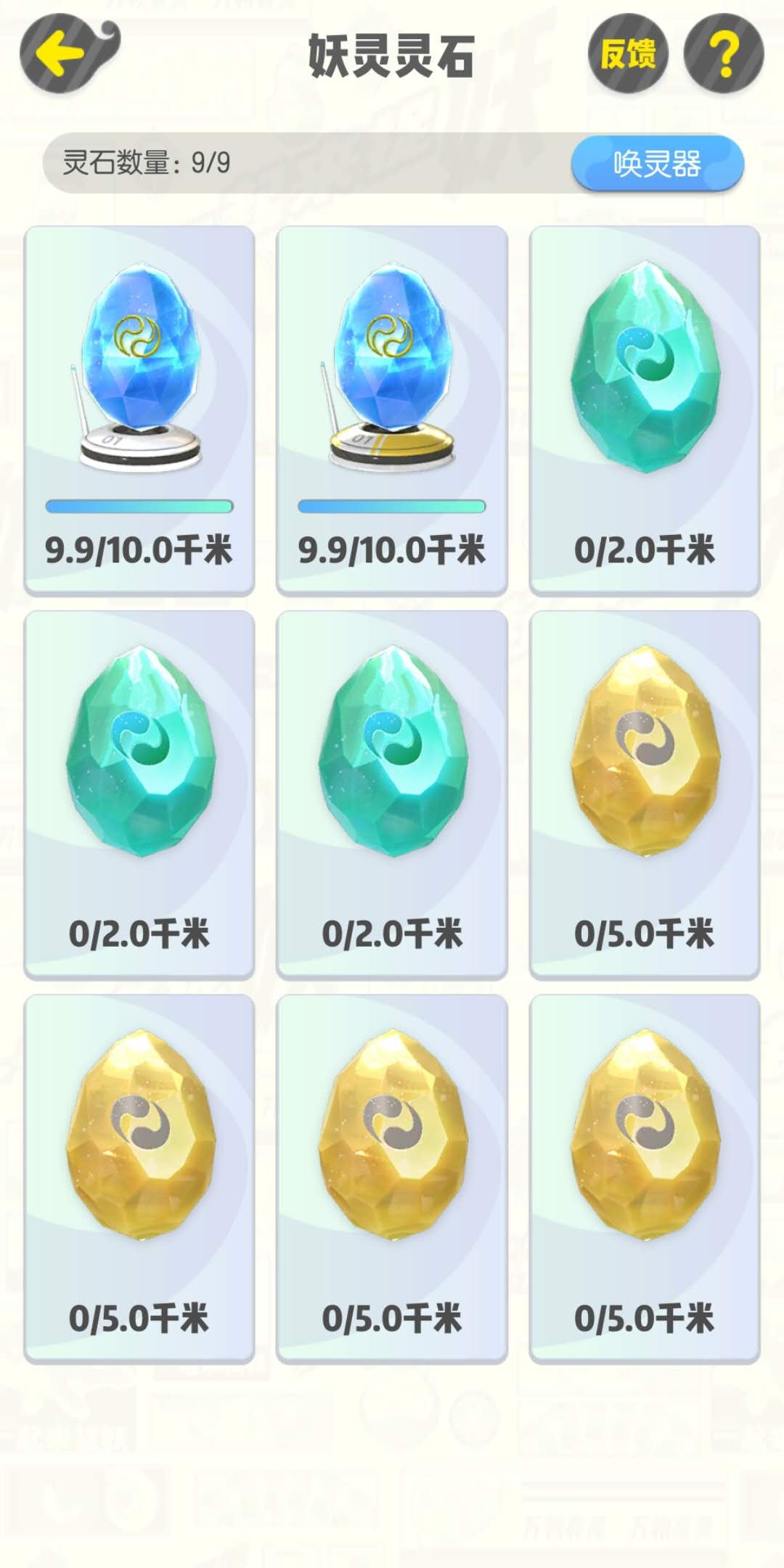上文提到灵石分三阶,初阶灵石(绿灵石):2千米、中阶灵石(黄灵石):5千米、高阶灵石(蓝灵石):10千米。放进唤灵器中行走指定公里数,即可孵化灵石中的妖灵。