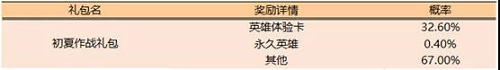 打开初夏作战礼包,可获得以下奖励之一:李元芳(3日/永久)、公孙离(3日/永久)、小乔(3日/永久)、夏侯惇(3日/永久)、铭文碎片(5/10)、钻石(5/10)、英雄碎片*1。