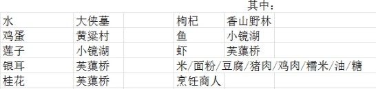 烹饪类型 名称 消耗体力 回复体力 好感度 总回复 效果 1 2 3 4 5 烤 神仙烤 80 30 0 90 两小时 胡饼 40 0 120 面粉 烤肉 40 0 120 猪肉/鸡肉 珍珠丸 40 0 120 糯米 江湖炙 43 1 129 鱼 甜雪 47 0 141 面粉 砂糖 光明虾炙 43 1 129 虾 金露酥 103 6 309 内劲1/s 面粉 燕窝 蛋 油 糖 煮 神仙煮 30 0 90 白水豆腐 57 1 171 井水 豆腐 玉粒粥 57 1 171 井水 米 桂花 浆水粥 73 2 219 井水 米 菜 莲子粥 73 2 219 井水 米 莲子 黑玉生滚粥 87 2 261 井水 米 猪肉 蛋 杂菜汤 60 2 180 井水 菜 白水鱼 60 2 180 井水 鱼 白水虾 60 2 180 井水 虾 白水肉 57 1 171 井水 肉 博饪 57 1 171 井水 面粉 含香粽子 70 1 210 井水 米 御黄王母饭 70 1 210 井水 米 糯米 雪纯羹 90 3 270 井水 米 猪肉 菜 莲叶羹 80 2 240 内会1% 井水 面粉 莲子 糖 百岁羹 73 2 219 血量2% 井水 豆腐 青菜 落雁雪酿鱼 90 3 270 回血5 井水 鱼 豆腐 菜 生进二十四馄饨 107 4 321 外会2% 井水 面粉 猪肉 虾 菜 饮中仙 97 3 291 内会2% 糯米 米酒 桂花 鸡蛋 虾 红河白龙 80 5 240 全属性2% 辣椒 豆腐 油 七返膏 80 2 240 血量4% 井水 面粉 蛋 油 汉宫棋 120 7 360 外会3% 井水 面粉 鱼翅 鸡肉 虾 赤霄 123 8 369 血量5% 井水 辣椒 鱼 菜 豆腐 炖 神仙炖 30 0 90 慈母游子羹 120 7 360 回血15/s 井水 豆腐 鸡肉 雪蛤 蛋 乌雌鸡汤 57 1 171 井水 鸡肉 冰花映月羹 117 8 351 内会3% 井水 银耳 桂花 枸杞 糖 乱炖 0 月桂金丝羹 93 7 279 全属性3% 井水 鱼翅 桂花 冷蟾儿羹 143 13 429 外会3% 井水 雪蛤 银耳 桂花 枸杞 酪心玛瑙 117 11 351 内会3% 井水 银耳 燕窝 糖 葵花斩肉 90 3 270 移速3%→30min 井水 猪肉 虾 蛋 赐绯雪蟾 117 8 351 御劲3% 井水 雪蛤 莲子 枸杞 糖 碧海玉露羹 117 8 351 化劲3% 井水 燕窝 莲子 枸杞 糖 十全大补汤 577 61 1731 幸运40 井水 雪莲 灵芝 人参 虫草 炸 神仙炸 30 0 90 油饼 47 0 141 面粉 油 煎豆腐 47 0 141 豆腐 油 稻香饼 0 龙凤糕 47 0 141 糯米 油 炸肉 47 0 141 猪肉 油 油炸鸡 47 0 141 鸡肉 油 炸鱼干 50 1 150 鱼 油 金玉荷包 47 0 141 蛋 油 见风消 53 0 159 糯米 油 糖 过门香 60 0 180 米 肉 油 凤凰胎 67 2 201 外强2% 鱼 鸡蛋 油 紫虚寒食饼 80 2 240 血量3% 井水 面粉 蛋 油 金酥鸡 80 5 240 移速4%→30min 鸡肉 辣椒 油 蒸 神仙笼 30 0 90 白龙雁 77 3 231 幸运20 井水 鱼 菜 稻谷饭 57 1 171 井水 米 素银夹花 87 2 261 命中2% 井水 面粉 鸡肉 虾 角黍 57 1 171 井水 面粉 单笼金乳酥 80 2 240 被疗3% 井水 面粉 鸡蛋 油 难得逍遥饼 63 1 189 内强2% 井水 面粉 糖 石蜜粽子 63 1 189 井水 糯米 糖 杂脯粽 70 1 210 井水 糯米 猪肉 水晶桂花糕 73 2 219 移速2% 糯米 枸杞 桂花 茶碗蒸 43 1 129 蛋 金栗虾蓉饼 73 2 219 回血10/s 井水 面粉 虾 鸡子羹 60 2 180 井水 蛋 月桂白露羹 83 3 249 被疗4% 井水 莲子 桂花 糖 柜枚 40 0 120 面粉 蒸饼 40 0 120 井水 面粉 清蒸鲈鱼 43 1 129 鱼 蒸干菜 43 1 129 菜 蒸豚 40 0 120 猪肉 豆腐蒸 40 0 120 豆腐 葫芦鸡 40 0 120 鸡肉 琳琅盖钟 57 1 171 井水 豆腐 猪肉 西江料 87 2 261 外会1% 井水 面粉 猪肉 菜 荷包饭 87 2 261 移速1%-30min 糯米 猪肉 蛋 虾 银颗金丝饭 90 6 270 幸运30-2 井水 米 鱼翅