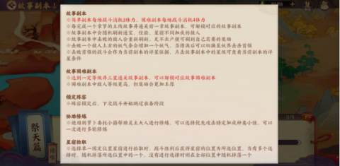故事副本中会随机刷新通宝、经验、星宿不同加成的敌人。简单副本每场战斗消耗3体力,困难副本每场战斗消耗4体力。