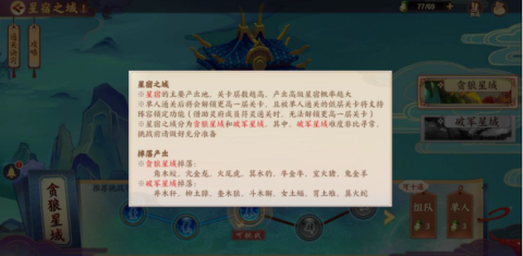 单人通关后将会解锁更高一层关卡,且被单人通关的低层关卡将支持阵容锁定功能(借助灵府成员符灵通关时,无法解锁更高一层关卡) 星宿之城分为贪狼星域和破军星域,其中,军星域难度非比寻常,挑战前请做好充分准备。