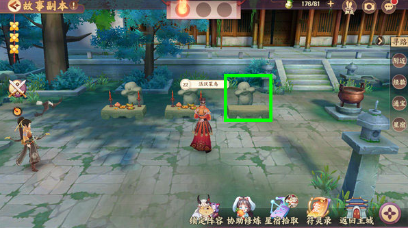 首先我们通过云游进入到祭天篇第三回中,和第二回不同的地方就是第三回中多出了一尊小石灵,但是和其他两桌供奉桌不同的是桌上没有食物。