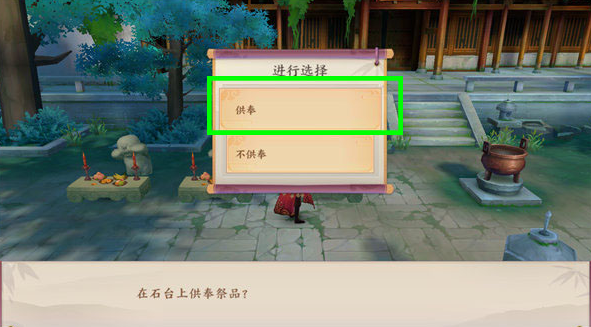 这时就需要我们上场了,走到桌子前点击石灵会弹出一个对话框问我们是否选择供奉,反正也没有损失,随便供奉了。点晚我们就发现了彩蛋已经完成,并且还获得了50份绢帛。