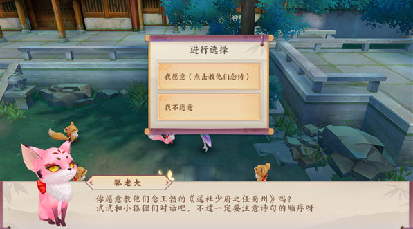 然后狐狸会让我们帮助小狐狸背诵诗歌,按照诗歌顺序对话:海内存知己,天涯若比邻,无为在歧路,儿女共沾巾。具体顺序如图,即2-4-1-3。