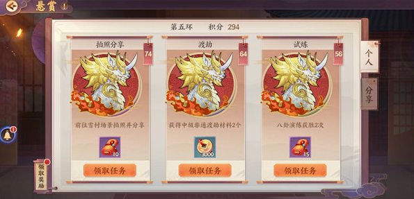 首先我们在悬赏任务中接取拍照分享任务,任务要求我们前往雪山村拍照分享。