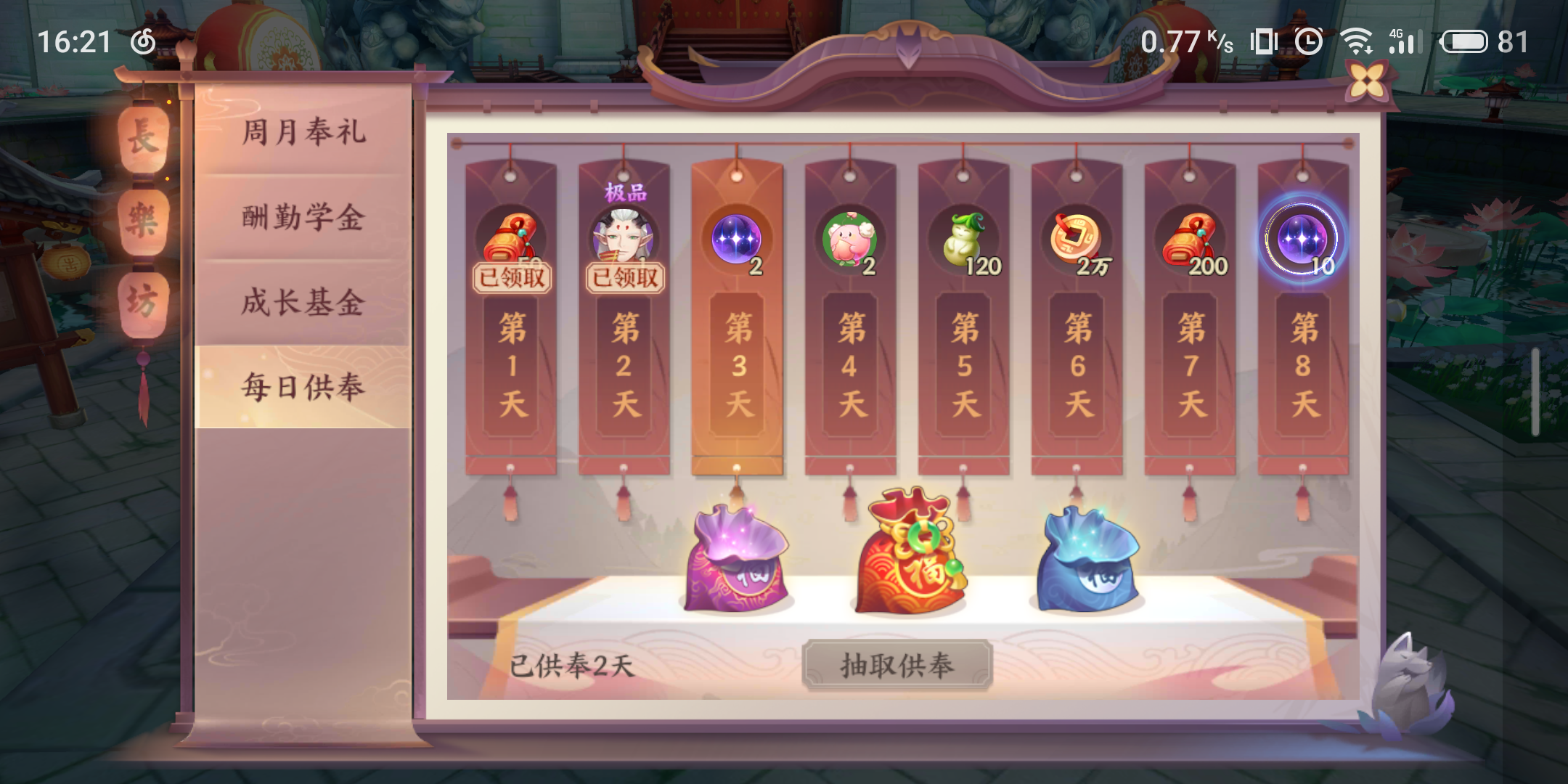 每日供奉其实就是系统送给玩家的特殊奖励,只要你每天登陆游戏就能抽取一份供奉哦,符灵、道具、货币应有尽有,大家什么都不用做,只需要登陆游戏就能获得,还是非常轻松的,最关键的是第八天的时候送给玩家朋友们十个高级星曜,还是相当大方的,对于前期缺少符灵的新手玩家来说实在太刺激了。大家一定要每天都来抽一份供奉哦。
