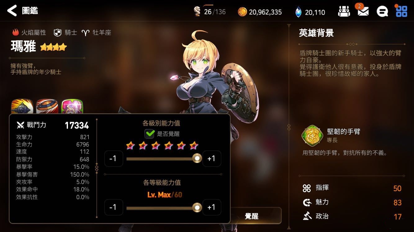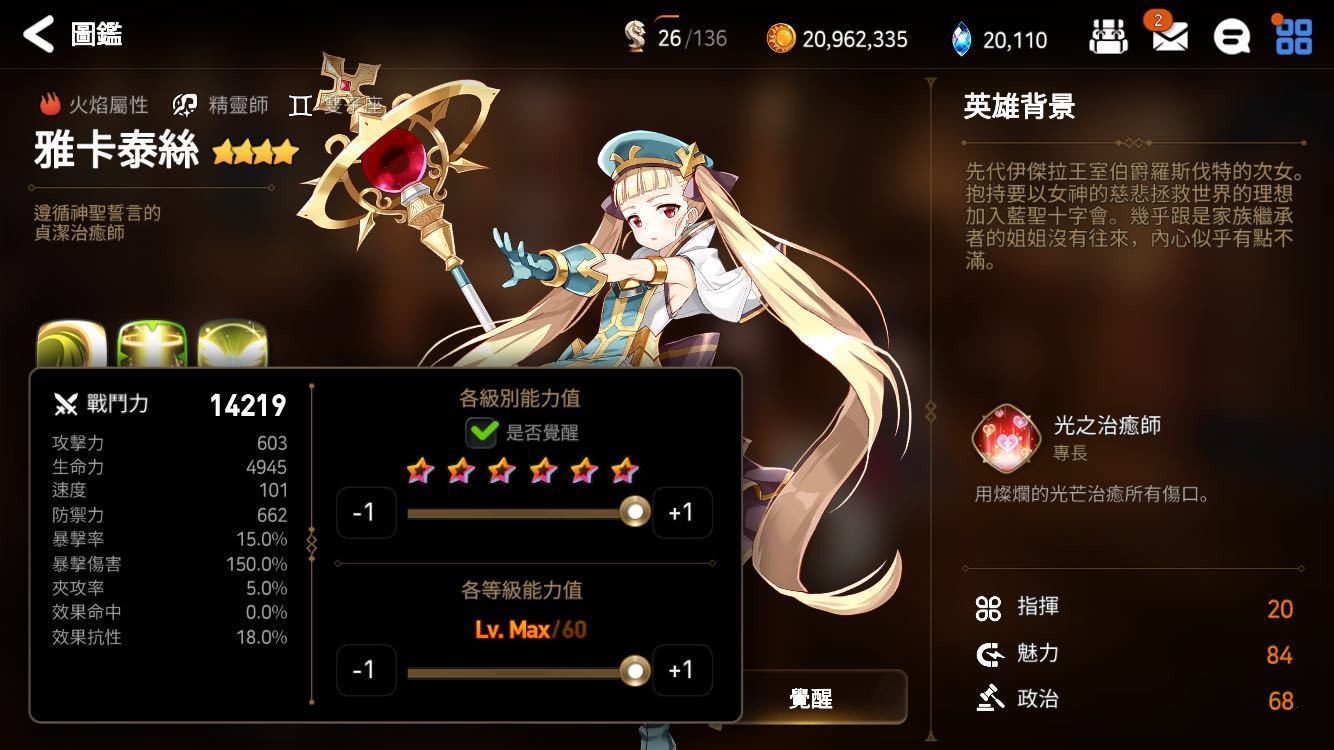 分析:先有请我们的女主上场。满级1200的攻击与160的爆伤算是火属性aoe输出中的佼佼者(三个技能都是aoe你怕不怕),有爱的同学练起来其实还是很强的。女主三个技能的特点在于短CD、吃人参提高大、都是aoe,一直aoe一直爽。