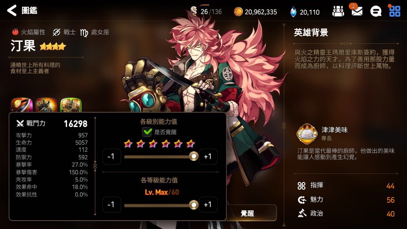 分析:火厨这个人呢,攻击太低,虽然技能aoe比较频繁,但是这里肯定是不建议带狗粮的。首先,他的3技能是一个全队驱散的效果,与火奶类似,但是没有加血,取而代之的是给在座的各位减一回合CD,这一回合看上去不痛不痒,但是真有暗拉兹这种CD只有两回合的人,你减一回合就是连动。由于战士职业的特殊性,可以在后期pvp控制极多的对战中佩戴【史特雷克拳套】,这满破60的抗性可不是闹着玩的。总之这是个很后期的朋友啦,和暗猫(猫咪克莱丽莎)的定位有些类似,萌新这里是不建议培养的呢。
