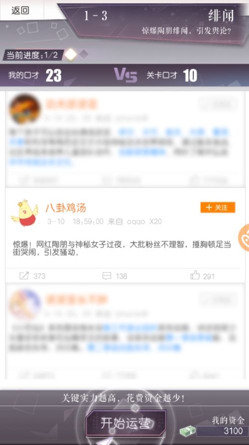 刚到S市的你,就跟大红大紫的陶月月来了一场绯闻风波。网上甚至传言你与陶月月深夜幽会,惹得粉丝们当街哭闹,纷纷粉转黑吖。不过别急,打开微博点击“开始运营”,事情会怎么发展还不一定呐!