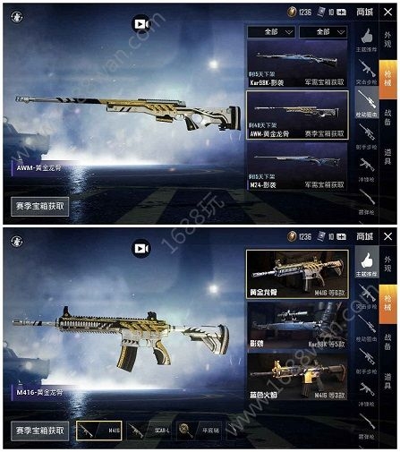 在精英手册解锁的100个付费奖励中,“黄金龙骨”系列的皮肤武器在玩家群体中的热度与欢呼声最高;目前在游戏中拥有该皮肤的武器有M416、Mini14、SCAR-L、AWM、P18c以及平底锅。而其中的“AWM与M416”的黄金龙骨皮肤最难获取,需要玩家解锁“SS1赛季宝箱”后几率抽取,是众多奖励中最具有收藏价值的。