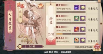 祈灵活动是七日藴灵活动中的一个小项目,大家可以通过不同的召唤来换取各种实用道具和紫色物品优昙花,其中包括5个小的召唤任务,想要全部完成还是比较容易的,其实道具都不是重点,最关键的优昙花才是不是玩家想要得到的东西,凑齐一百个可以换绝品符灵应龙哦,活动时间只有一周,大家快点去完成任务吧。