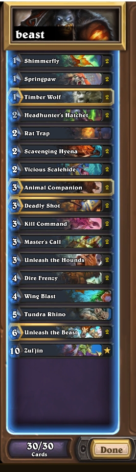 打盗贼或者机械猎等抢脸卡组非常关键的牌,配合凶猛狂暴。如果条件允许的话,建议先凶猛狂暴洗,再用主人召唤抽牌,这样能保证大概率拉出246突袭吸血。但是问题是,打盗贼的时候还是太慢了。麟皮兽+凶猛狂暴需要6费打出,而一个手牌不错的盗贼6费7费已经开始算斩杀了。我见过有人的构筑带狂野怒火(给一个野兽本回合+2攻击力和免疫)和野兽之心(给一个友方野兽+1/+1并使其随机攻击一个随从),不过这样的话就太过于针对盗贼,打别的职业不一定好打。