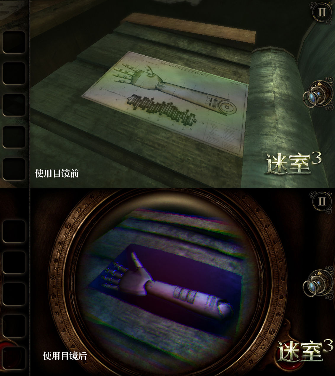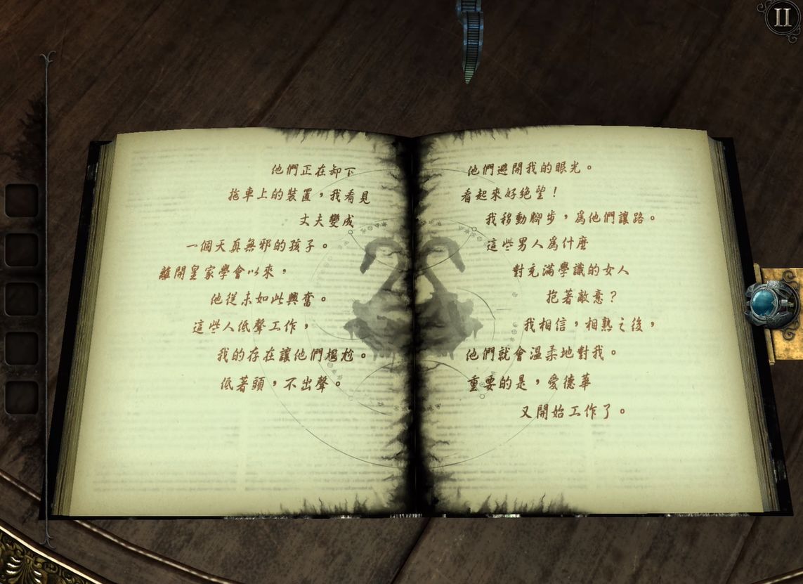 《迷室》(The Room)系列作为解谜游戏,也将克苏鲁神话元素融入玩法之中。“目镜”是游戏的关键解谜道具,当玩家面对某些机关毫无头绪的时候,尝试使用目镜,或许会看到截然不同的画面,从而找到解开谜题的重要线索。除此之外,玩家还可以利用目镜从漂浮着碎片的入口进入虚空世界,去探究更为深层的秘密。就算是在一些普通场景,戴上目镜也能观察到更多信息。可以说目镜的设定相当于克苏鲁神话中的真视之力,能够让人类看到宇宙的真相,但同时,知道的东西越多也越可能陷入疯狂。