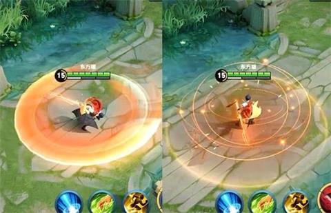 1技能,东方曜使用剑劈砍对敌造成伤害,积满能量后可以看到技能图标变化,同时强化的技能有读条时间,期间东方曜可以释放任意一个强化技能,比如释放1技能(强化)后的橙红色光效范围变大!