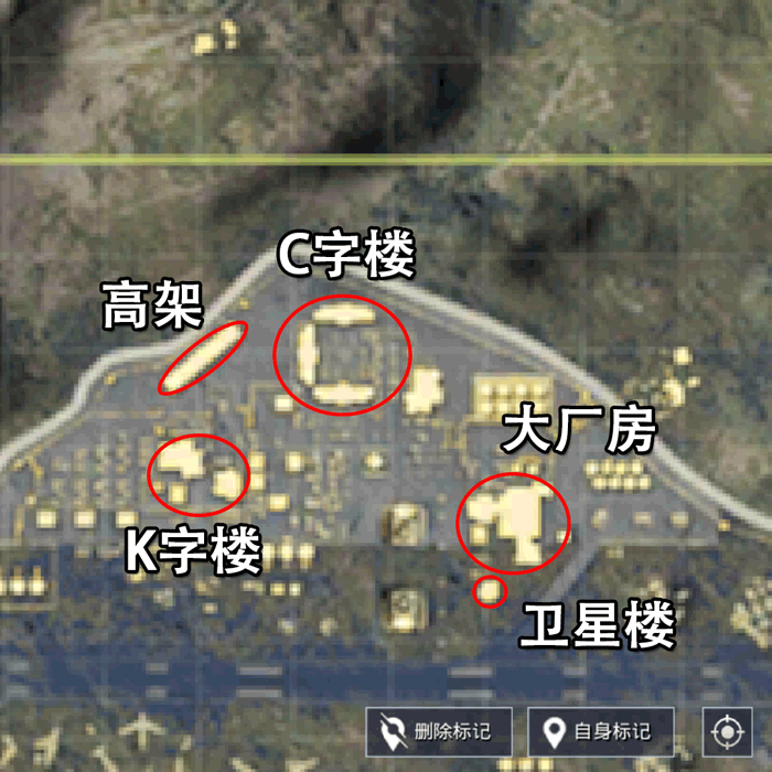 军事基地作为最热门的资源点,点内的建筑物都被玩家起上了独一无二的名字,这也方便我们讲解。军事基地跳伞的热门落地点基本都在图中做了标记,其中人最多的地方就是位于中心位置的C字楼,其他的地方人数都差不多。