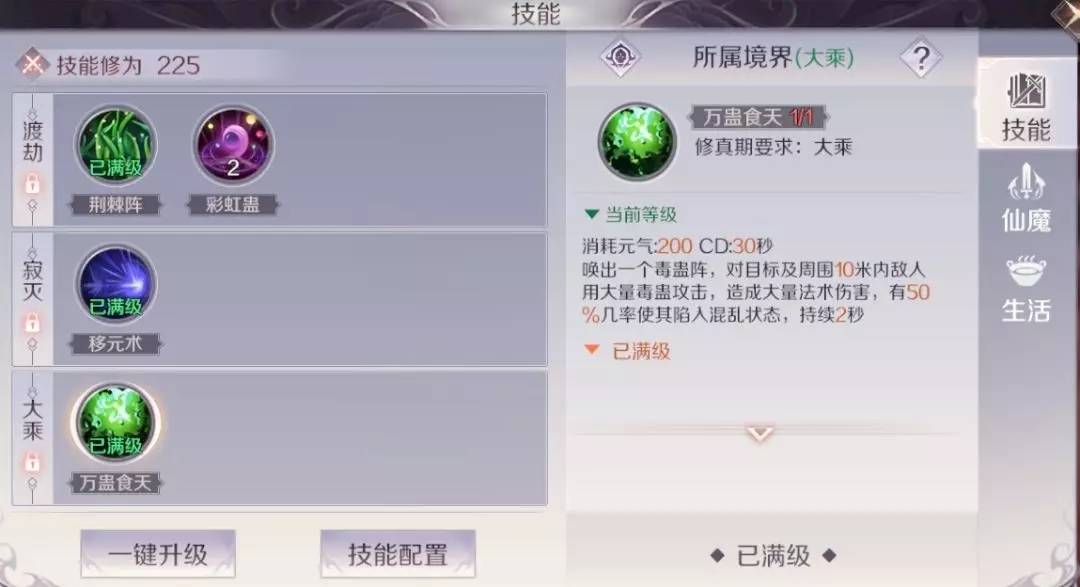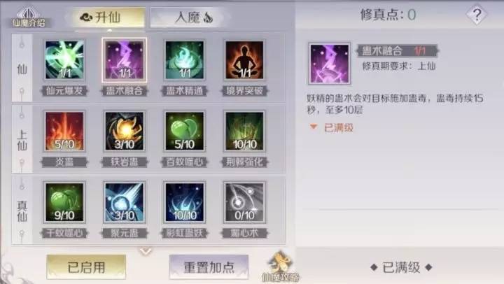 呆毛重点介绍一下仙妖精的“蛊术融合”,此技能能够给目标施加蛊毒效果,蛊毒叠到10层后,引爆的伤害很可观,所以尽量在蛊毒叠满十层后再释放蛊毒爆发。