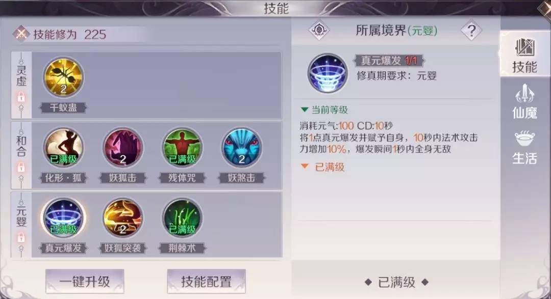 当然,技能“真元爆发”也可以提升伤害,但“爆元”带来的伤害提升不如“万蛊食天”带来的直接伤害效率高。不过“爆元”技能爆发瞬间处于无敌状态,且升仙入魔后还有回复生命值的效果,所以修真者可在保命或抵挡boss大技能伤害时使用“爆元”技能。