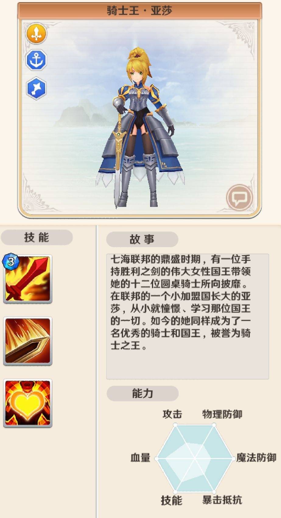 水系的前排: 骑士王,被动能力给自己在开局提高超额的防御能力,是所有前排中开场最强的防御能力,技能有眩晕和击退效果,往往还会跑去切对方后排(前排被击退了然后更换攻击目标选到了对方后排。)相当好用的前排角色。