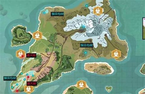 下图蓝点为猴面包树刷新位置,小伙伴们如果有其他地方发现了猴面包树,也欢迎在评论中留言告诉大家。