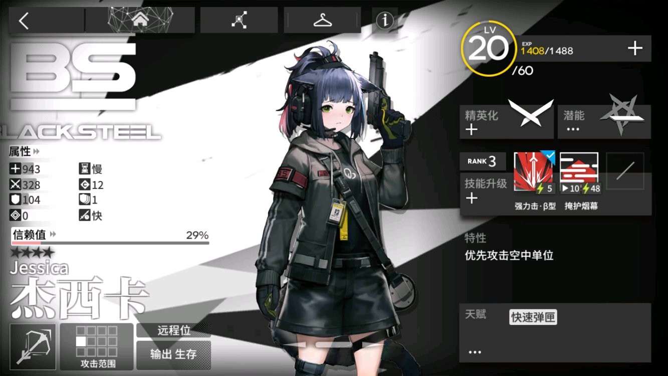 所以,我们最好先精英化狙击干员。在狙击干员中,我建议优先精英化杰西卡。她的对空狙击能力不能说特别优秀,但是足够我们应对敌人了。而且,虽说精英化可以全面提高干员的属性,还可以让干员解锁新的技能与天赋,但是这些都是有代价的。精英化的干员将会增加cost值。这意味着,如果我们想用精英化干员,就必须对已经做到最佳搭配的阵容做出调整。而杰西卡帮我们减轻了这个烦恼。因为,杰西卡本身的部署费用就没有很高,精英化后的费用也在我们可接受的范围内。