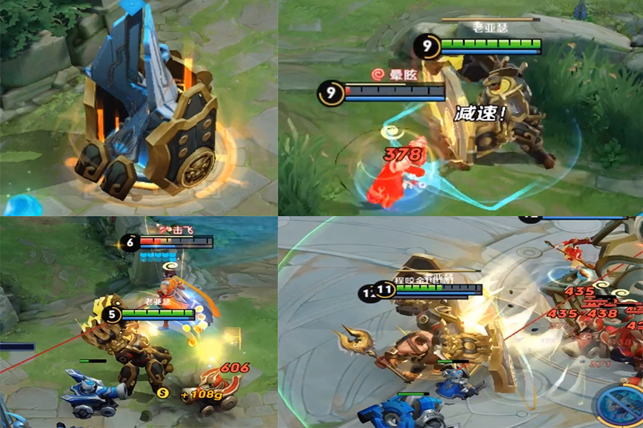 技能特效和早期的爆料一致是黄色效果,并不是十分显眼,可能是官方测试视频中没有开最高特效。与防御塔合体时两扇大门看起来还是很霸气的。