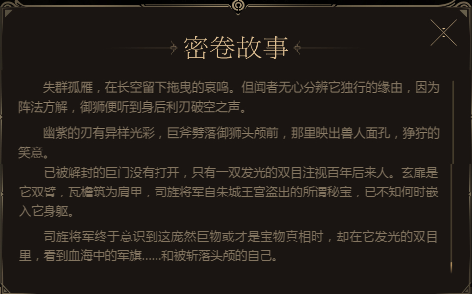在这款皮肤的背景故事中,提到了御狮和御旌合作前往寻找秘宝的剧情,最后在御狮解锁破解阵法后,却被身后的御旌直接削了。从地丑一贯的伏笔套路来看,这里提到的斧刃有异样光彩,所以御旌应该是又被秘宝操控了。另外前往有提到一个刻有龙纹的石柱,所以某喵奶一口下一款隐龙系列皮肤是苏烈。