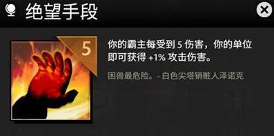 首先这个天赋的效果是你的霸主每次受到5伤害,你的单位就能获得+1%攻击伤害,霸主就是我们玩家选择的人物主角,简单来说就是你的血越少,棋子的攻击力就越高,最多能提升+19%的攻击伤害,这在最后的决战中是一个非常好用的天赋。