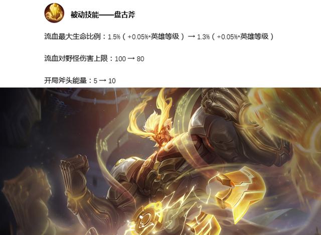 盘古削弱:流血伤害降低,对野怪的伤害降低,清野速度下降,但回调了盘古斧的耐久度。