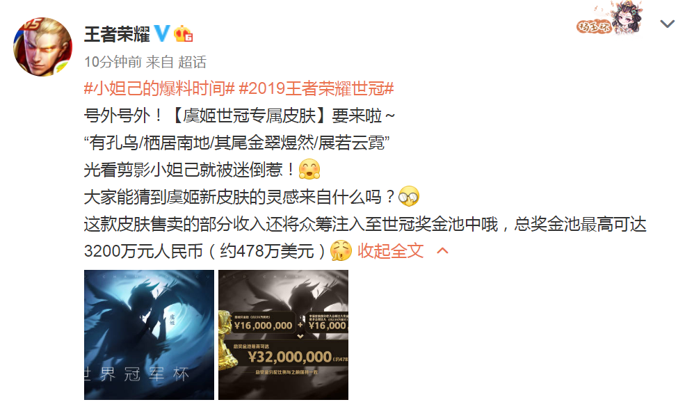 按照官方当前的爆料,这款虞姬世冠专属皮肤会将出售的部分收入放入世界冠军杯奖池内,所以世冠的比赛时间是在七月十号至八月十号期间,而皮肤的上架时间可能会在世冠开启时也就是七月初上架。
