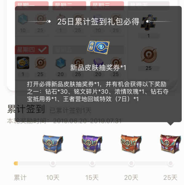 最后是王者营地的每日签到福利活动,在今天更新后替换了奖励,周天签到直接可以获得一个英雄碎片,累计25天可以必得英雄碎片、皮肤碎片和新品皮肤抽奖券,另外有小概率获得其余的一些道具。累计签到每月重置,也就是移除了点券夺宝抽奖券,但是增加了其他的奖励,特别是英雄碎片。