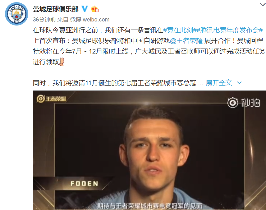 然后是曼城足球俱乐部公布的与王者荣耀合作的活动,七月份上架一款曼城回城特效,通过活动来直接免费领取,应该是曼城的图标特效。