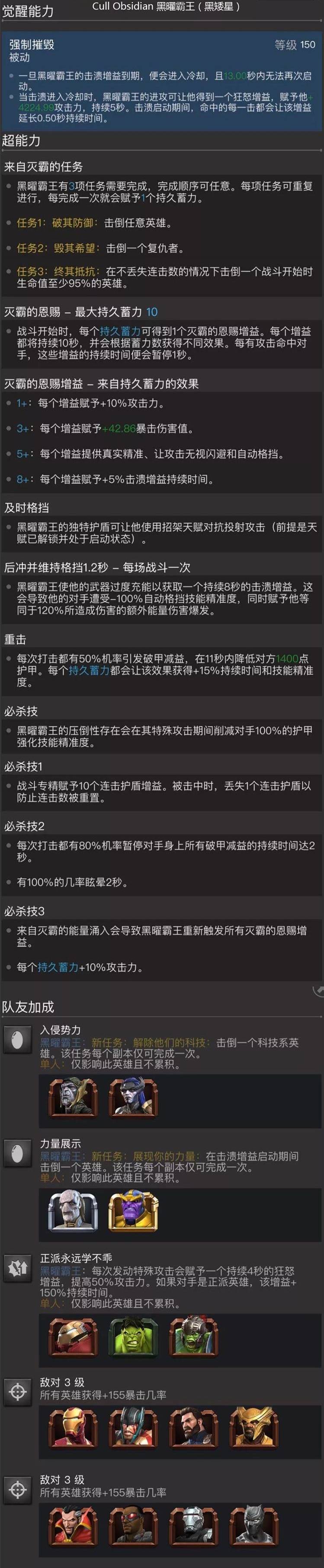 说完他的优点,再来点一下他的缺点,首先作为一个靠破甲为生的英雄,肯定打不了免疫破甲的或者类似免疫破甲的节点,像黄石头就是他的天生的克星,再者他的打法是靠重击为主,碰到免晕或者柔软节点也比较麻烦,其他像猛击节点,也会开局吃了他的灭霸恩赐,最关键的一点就是黑曜的格挡效率不高,正常招架过程中也损血的厉害,一开始我看到这么大个块头还以为是个肉盾,其实他也是个纸糊的,为了这个我还特意去翻了下其他几个大块头,发现这好像是大块头的通病,什么毒液,多玛,浩克,毒鸭,清一色的都低的很。这点确实是他的最大的缺陷,如果打一整条线的话,难免后续血量不足,坚持不到最后。