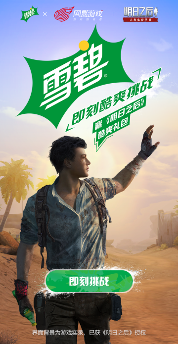 2019年6月21日至9月30日,网易游戏《明日之后》跨界联合雪碧,开启夏日酷爽挑战!15亿瓶活动雪碧酷爽上线,购买活动指定雪碧并扫描瓶身二维码,参与“雪碧即刻酷爽挑战”,挑战成功即有机会领取《明日之后》夏日游戏礼包!