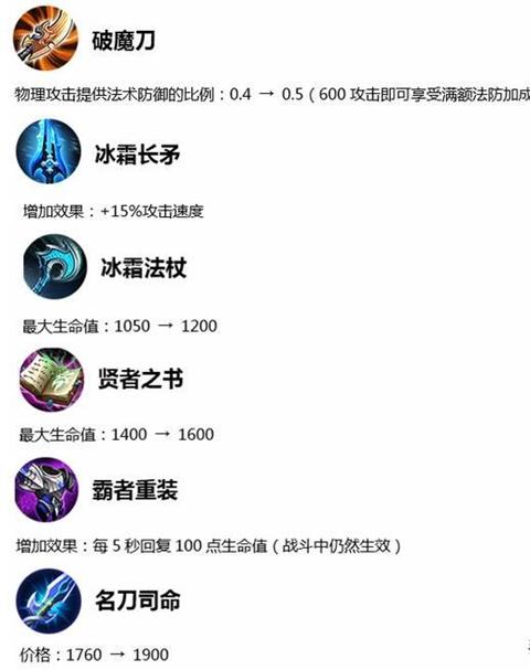 装备:冰霜长矛加强,增加15攻速效果,战士类英雄可尝试装备;破魔刀加强,获得满额法抗的AD比例下调,半肉英雄可尝试装备;冰霜法杖加强,提升200点生命值;贤者之书加强,提升200点生命值;霸者重装加强,增加每5秒回复100生命值的效果,提升了战斗状态下的续航能力;名刀价格上调,略微降低了对攻节奏!