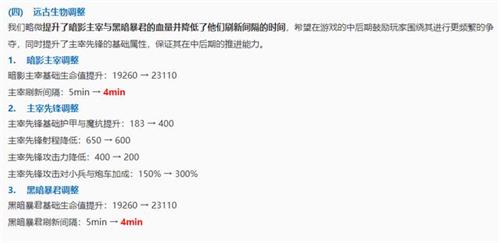 对打野的另一个影响就是远古生物调整。暗影主宰和黑暗暴君的刷新时间从原本的间隔5分钟调整为4分钟;同时主宰的生命值以及护甲魔抗大幅提升,这就意味着现在打野很难在短时间内单刷掉主宰,如果想要快速打主宰必须要有射手在场,偷主宰几乎成了不可能的事情,提高了双方的对抗性。