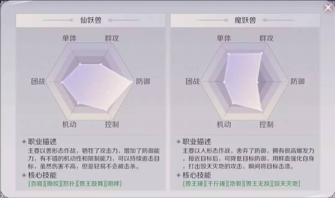 妖兽:团队buff技能可给队友加成血量上限和攻击力,技能毁天灭地能造成无视防御的大量伤害。