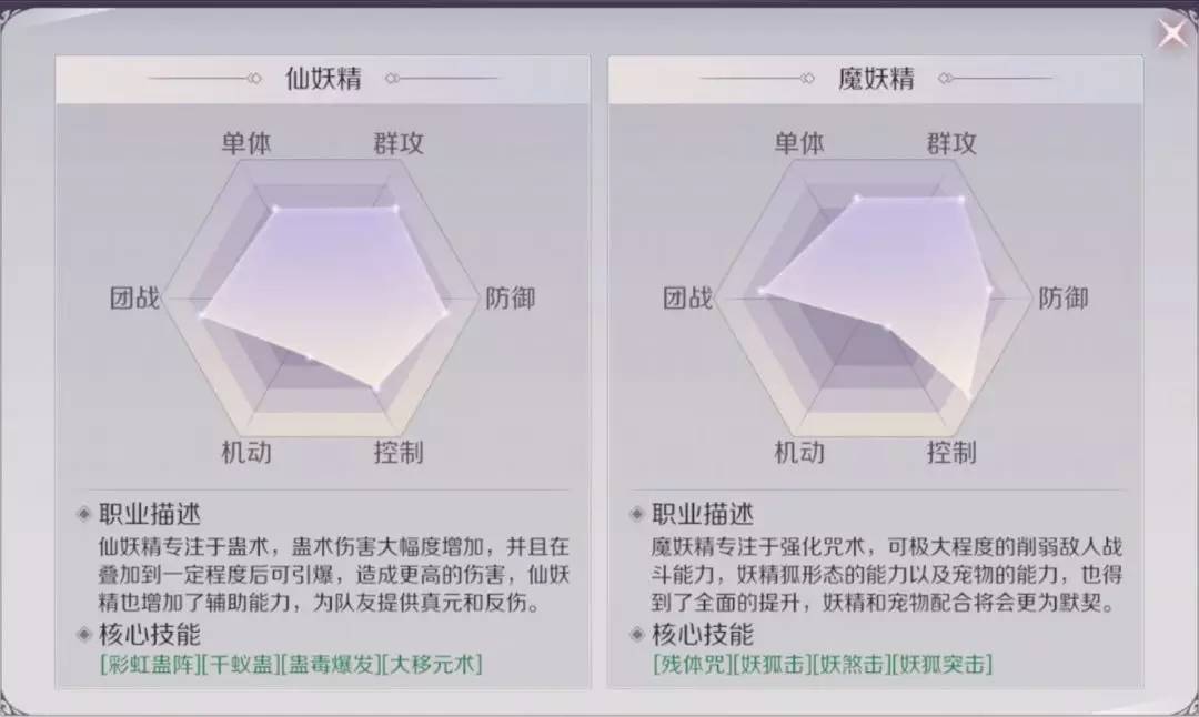 妖精:团队buff技能可加反伤效果,也可为队友提供元气。有宠物协助作战,不同宠物效果不同(嘟嘟熊控制效果很强,飞天猪的射程远且单体伤害高,大力神有群控效果和群体无视防御的伤害效果)。技能还可驱散敌方目标身上的增益buff,拥有多种减益效果,降低敌方目标双防,使目标受到伤害增加。