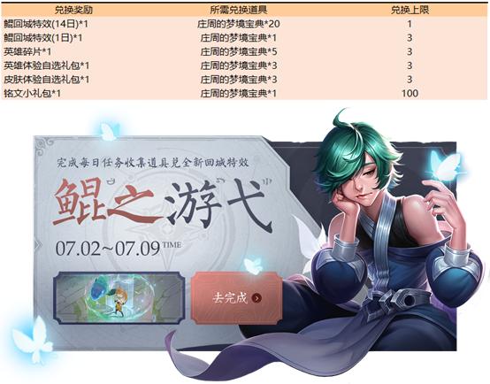 通过累计登录、参与实战、钻石兑换获得庄周的梦境宝典,再消耗20个庄周的梦境宝典兑换鲲之游弋回城特效(14天),目前该回城特效暂未开放永久权限的获取途径。